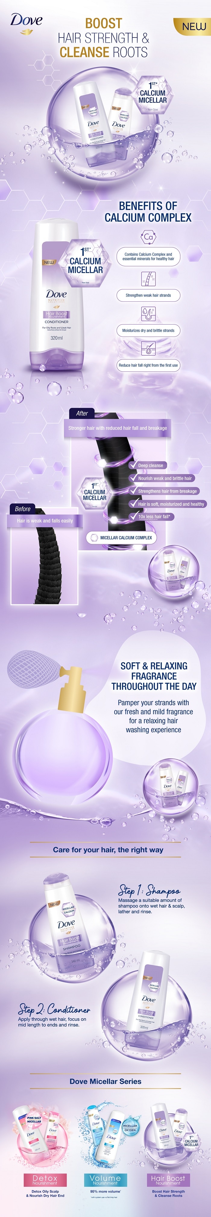Healthy hair starts with healthy roots. That is why we created a unique range to care for both your hair roots & tips. New Dove Hair Boost Nourishment with Micellar and Calcium Complex, cleanses hair roots and boosts hair strength from root to tip. Its weightless formula deeply cleanses hair roots, removing excess oil, dirt and damaging build up. It also nourishes weak hair, making hair resilient & thicker-looking.