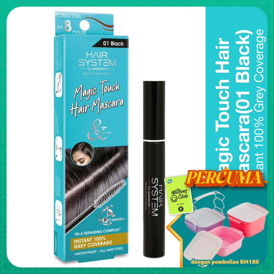 Promote paper packaging made with paper from responsibly managed forests, or with recycled content The paper used in this packaging is certified by FSC. Discover the power of Hair System by Watsons, your total haircare solution. Tailored to your individual needs in collaboration with hair experts and influencers from across Asia, this holistic haircare system features a unique range of products for every hair type, each meticulously engineered with advanced technologies and trademarked complexes to bring you a professional salon experience at home.Hair System by Watsons Hair Mascara is specially formulated with Absolute Conceal*ingredients to cover your grey hair in a flash. It is also enriched with Ida Repairing Complex** plus Pro Vitamin 135 for an all-rounded colour treatment to reveal healthy and energetic looking hair.