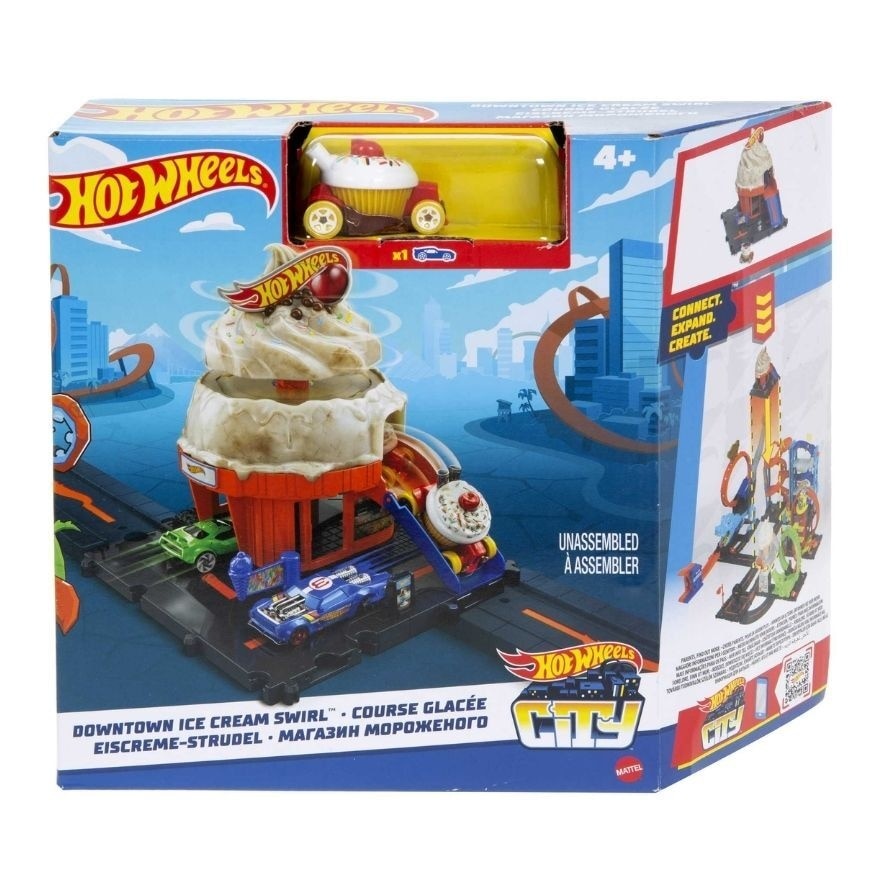 The Hot Wheels City Downtown Assortment allows kids to create their own cityscape loaded with stunts and cool adventures. Each set plays into the Hot Wheels City nemesis theme, incorporating elements that a creature could be lurking nearby, just waiting to pounce. They all connect to other Hot Wheels sets through multiple connection points and each comes with one Hot Wheels vehicle for push around play straight out of the box. With familiar locations such as a repair station, a burger drive thru, a car wash and parking garage, kids will want to collect them all for endless storytelling possibilities. Each sold separately, subject to availability. Colors and decorations may vary.