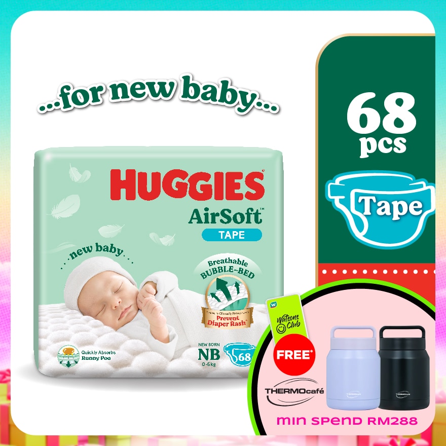 HUGGIES AirSoft Diaper for Newborn Babies is specially designed with Breathable BUBBLE-BED to protect baby's delicate skin.