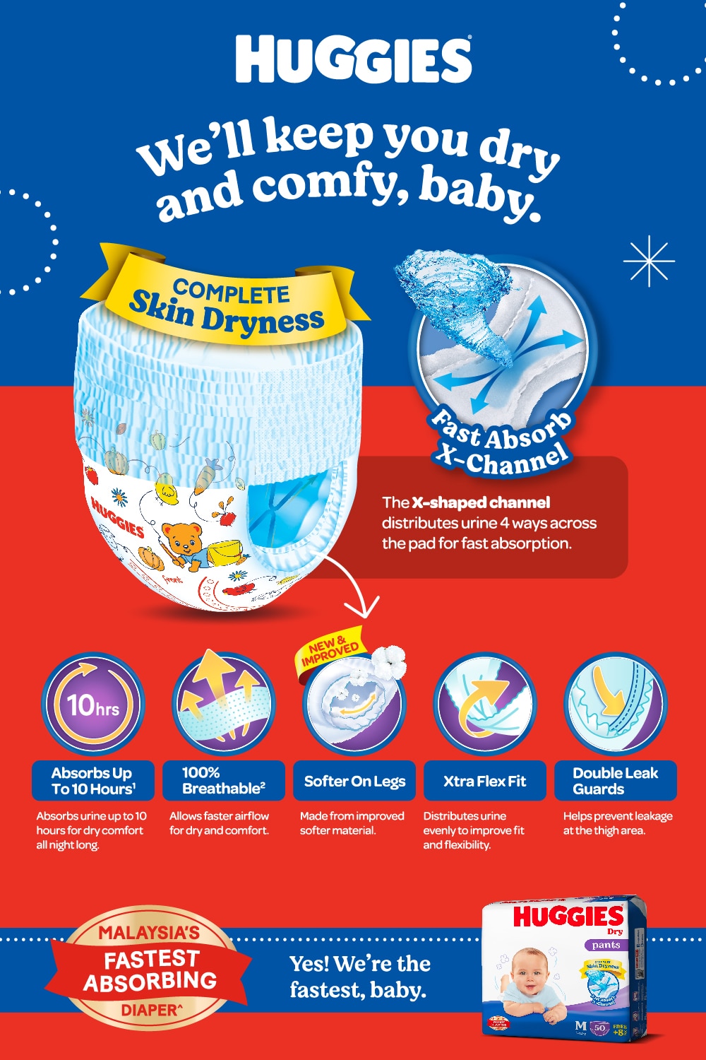 Huggies Dry Pants gives your baby Complete Skin Comfort with Fast Absorb X-Channel. We're Malaysia's Fastest Absorbing Diaper!