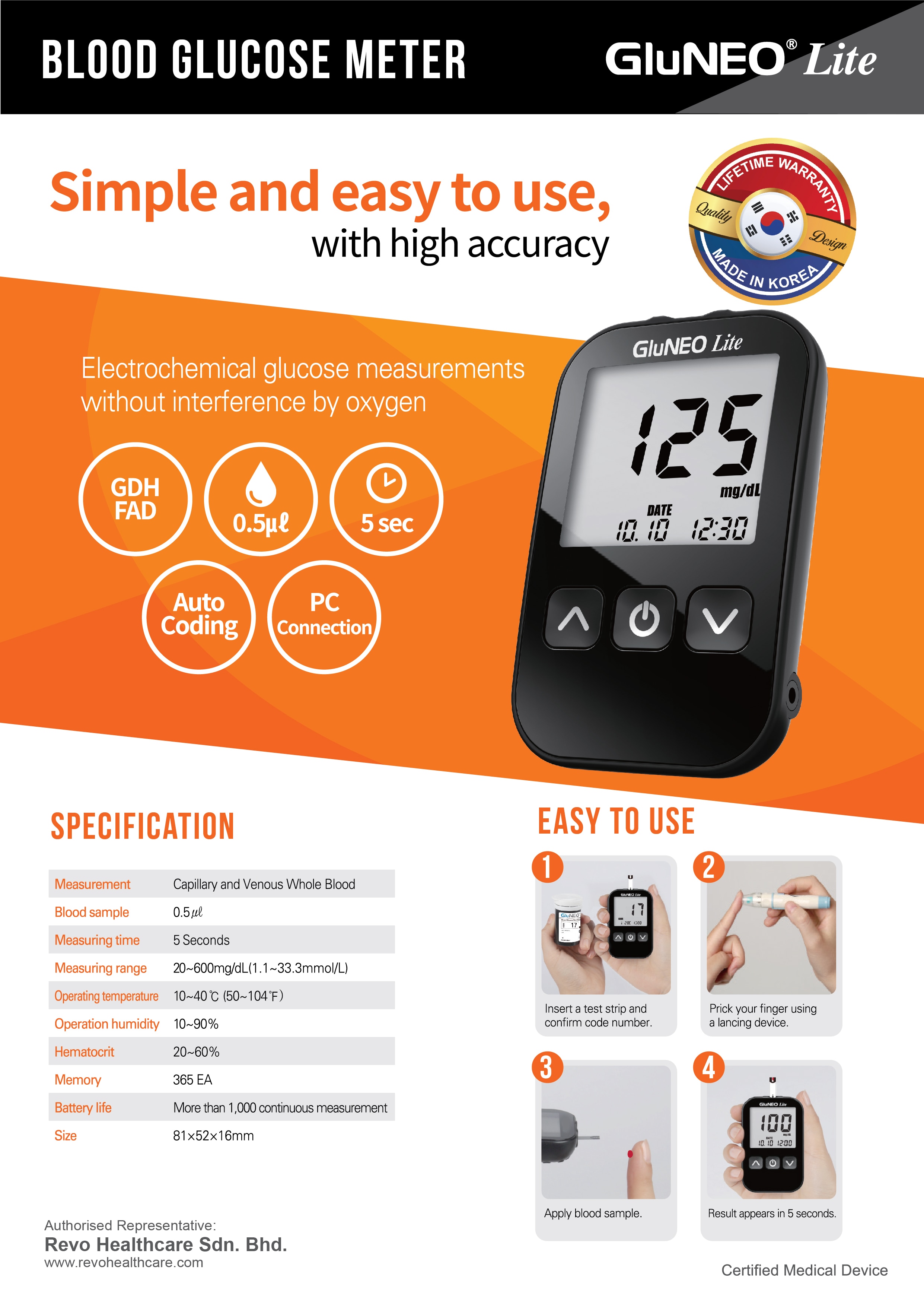 1. Insert a test strip and confirm code number 2. Prick your finger using a lancing device. 3. Apply blood sample. 4. Result appears in 5 seconds. For GluNEO Lite Blood glucose test meter use only