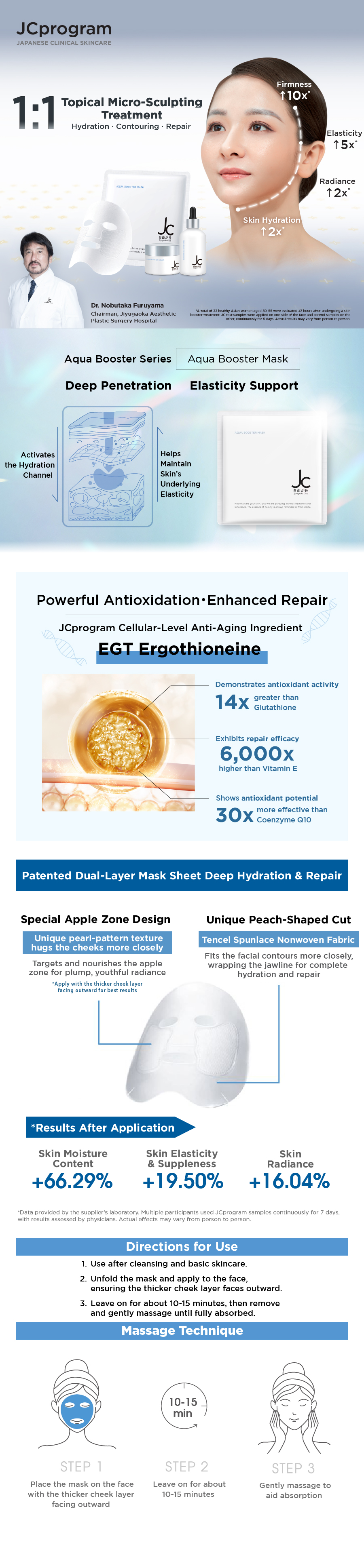JCprogram Aqua Booster Range contains a full-dosage of Hyaluronic Acid Skin Booster, using "Non-Invasive Cargo-Delivery Technology" to provide the skin with 1:1 Hyaluronic Acid Skin Booster treatment effect.