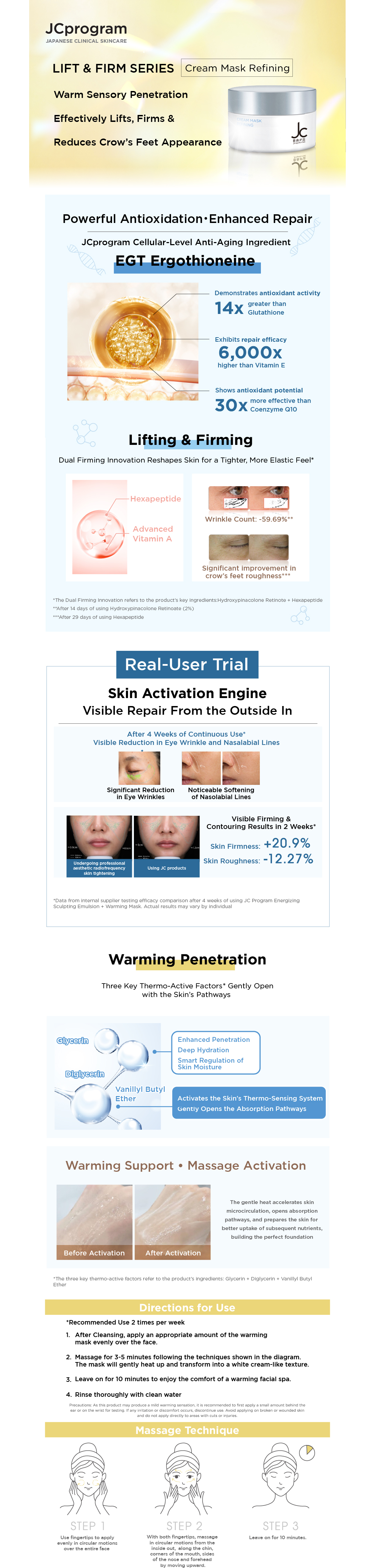 JCprogram was founded by Dr. Nobutaka Furuyama, known as "Asia's First Pioneer of Minimally Invasive Aesthetic Treatments". JCprogram Cream Mask Refining contains Granactive Retinoid (Hydroxypinacolone Retinoate, a Vitamin A derivative) and Acetyl Hexapeptide-8. It's honey-like texture and specialized warm sensation during application help enchance the absorption of essence, reviving skin suppleness. JCprogram Cream Mask refining helps to improve skin tightness by 46.20% in 4 weeks. Day after day, it enhances the V-shaped contour of your face. Specialized warm sensation: Glycerin combines with the skin's surface moisture to generate warmth."Product self-evaluation performed by 3rd party laboratory on 33 subjects at the aged from 33 to 59 years old.