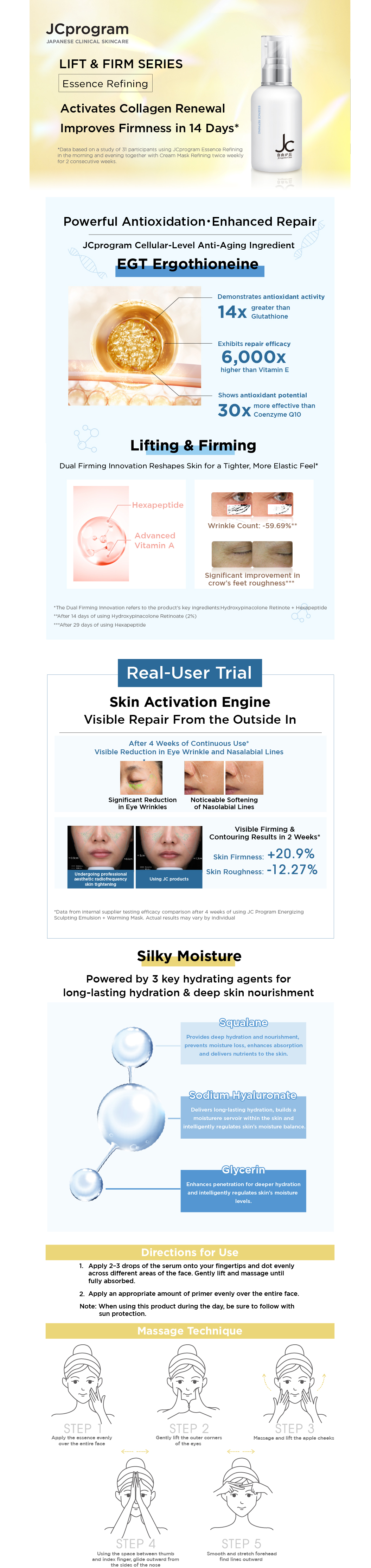 JCprogram Essence Refining targets aging skin by helping to improve skin firmness by 12% and reduce fine lines by 32% after 4 weeks of use.#