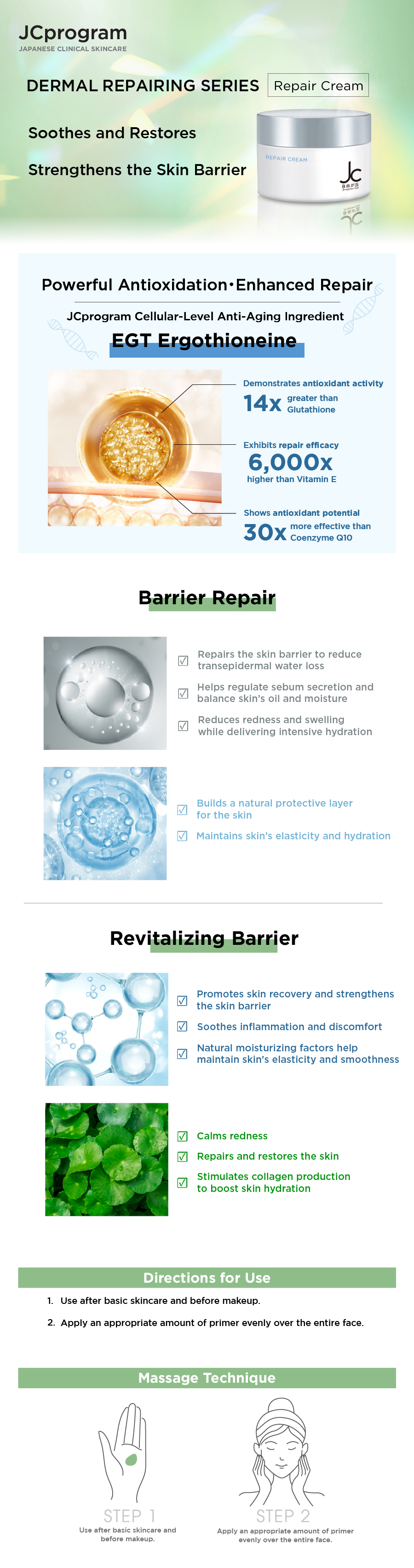 With a silky and luxurious touch, JCprogram Repair Cream contains concentrated Madecassoside to nourish skin, which helps to increase skin firmness and revive skin smoothness.