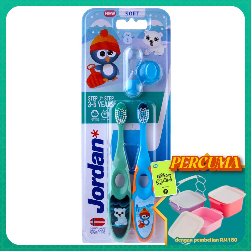 Jordan Step 2 toothbrush is tailor-made to brush children's smaller milk teeth. Designed with soft bristles, a small but wide head and a dual handle for both parents and kids, makes brushing easier. The blue bristles on the toothbrush are there to help you put the right amount of toothpaste on each time.