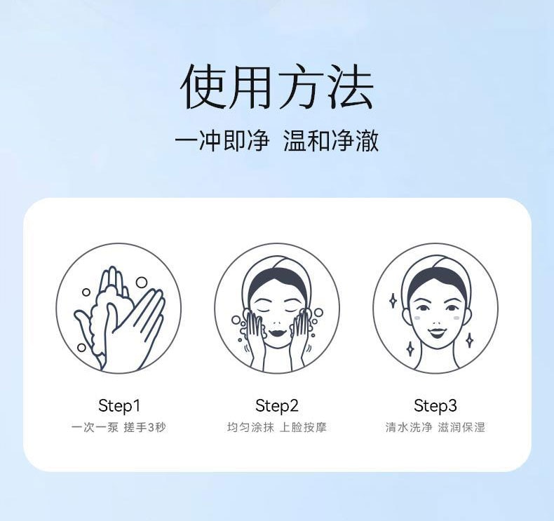 Take an appropriate amount of this product in the palm of your hand, add water and rub it into a foam, apply it on the face, massage gently in circular motions, and then rinse off with water.