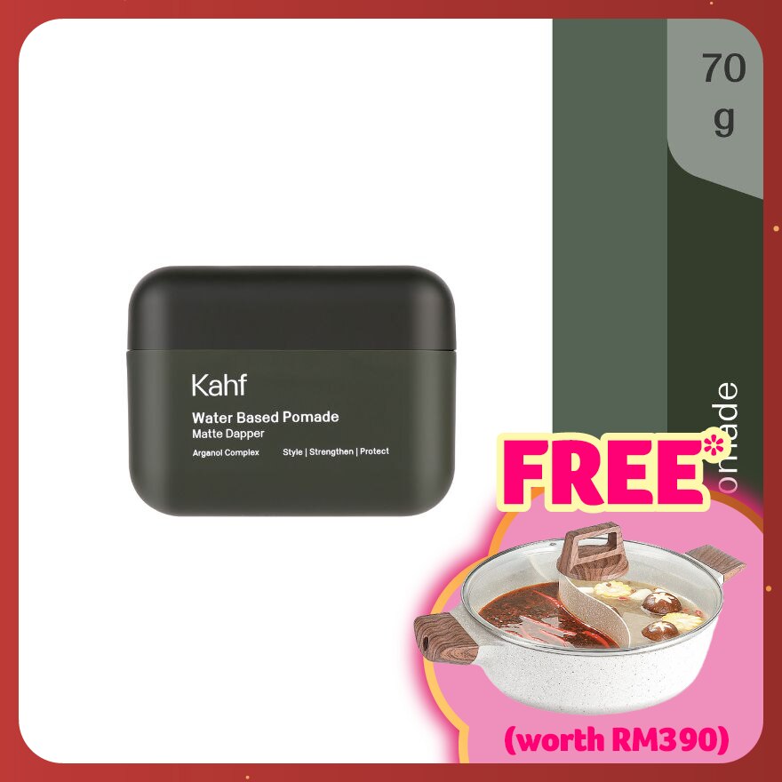 Kahf Matte Dapper Water Based Pomade 70g merupakan Hairstyling Product pertama dengan HairPower Technology yang bantu menata, merawat, dan melindungi rambut. Solusi untuk gaya rambut yang tahan lama, kuat, dan dengan tampilan matte yang mudah ditata ulang hanya dengan sapuan tangan dan mudah dibersihkan. Diperkuat dengan nutrisi dari Panthenol and Arganol Complex, yang melembabkan dan menguatkan rambut. Melindungi rambut dari efek buruk sinar UV dan polusi (warna memudar, kasar, dan kering). Produk ini sudah terbukti secara klinis tidak akan menyebabkan dry scalp.