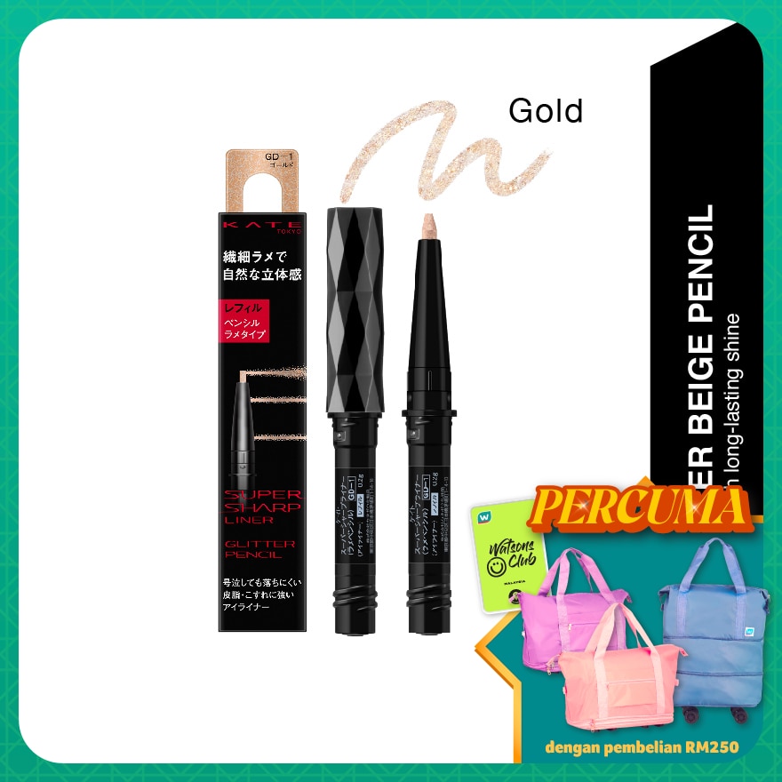 Apply the Sheer Glitter Beige Pencil on the lids to expands vertically, on the inner corners to expands eye width, and under the eyes to emphasizes the eye bag. Use it together with the KATE Super Sharp Liner EX4.0 to create eyes with even more impact.Use by setting it into the holder of KATE SUPER SHARP LINER EX4.0, sold separately. Replace without removing the cap. When removing the refill after use, holding the cap in your left hand and turning the holder to the left will make removing easy.