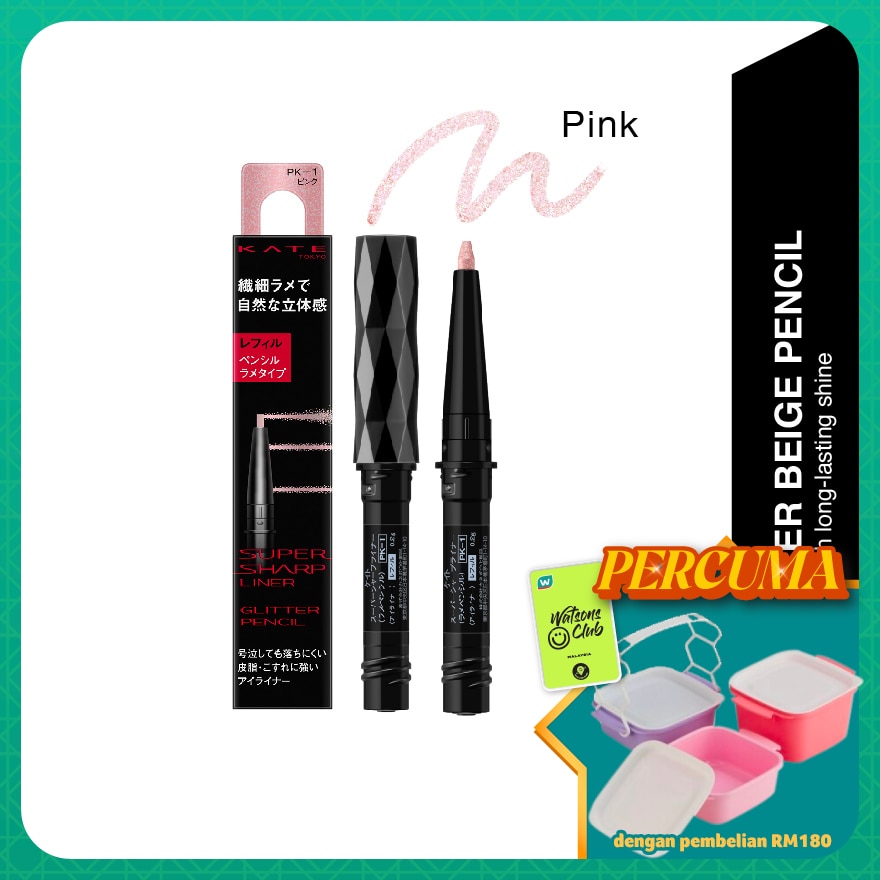 Apply the Sheer Glitter Beige Pencil on the lids to expands vertically, on the inner corners to expands eye width, and under the eyes to emphasizes the eye bag. Use it together with the KATE Super Sharp Liner EX4.0 to create eyes with even more impact.Use by setting it into the holder of KATE SUPER SHARP LINER EX4.0, sold separately. Replace without removing the cap. When removing the refill after use, holding the cap in your left hand and turning the holder to the left will make removing easy.