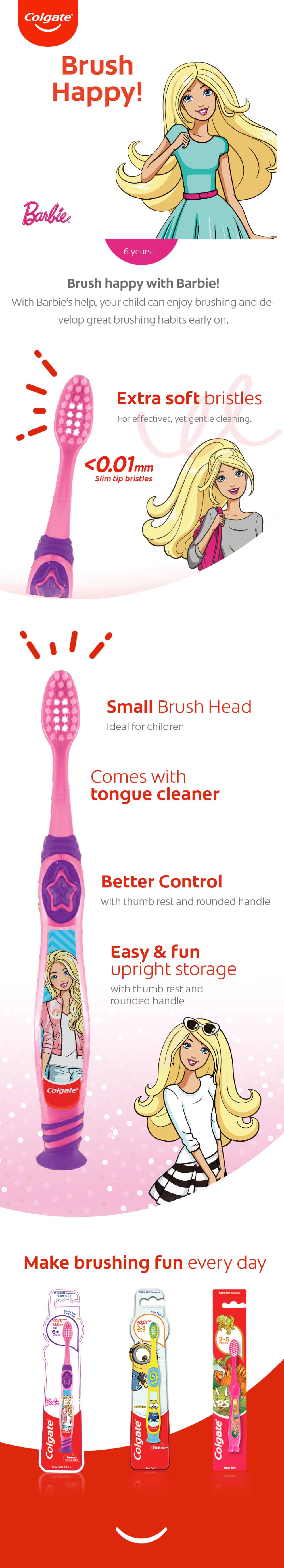 - Barbie graphics in a convenient stand-up tube with flip-top and laydown tube that encourages kids to brush