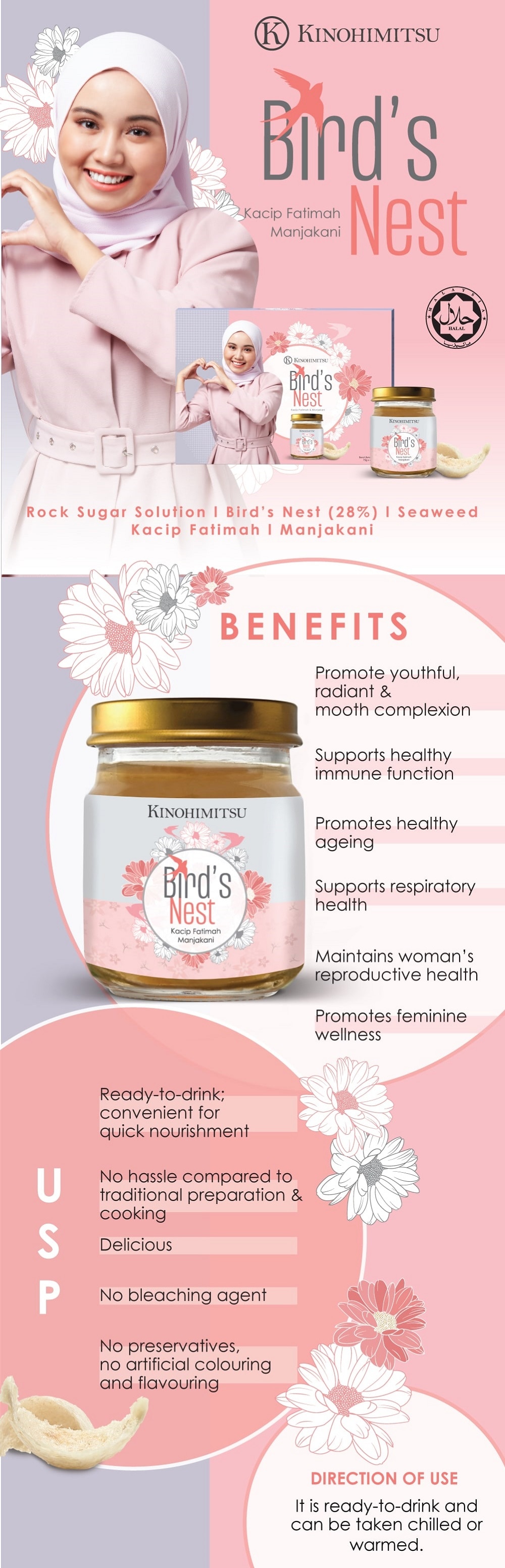 Rock Sugar Solution, Bird’s Nest (28%), Seaweed, Kacip Fatimah, Manjakani.