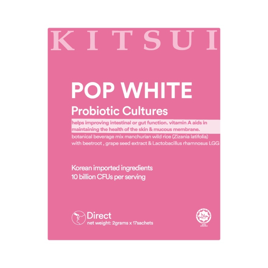 Prebiotic (Inulin) (1.25g, 62.5%), Probiotic (Lactobacillus rhamnosus LGG) (10%), Ascorbic Acid, Vitamins and Minerals (Vitamin A, Vitamin D3, Biotin, Folic Acid, Niacin, Pantothenic Acid, Thiamine, Vitamin B12, Vitamin B2, Vitamin B6, Vitamin C, Calcium, lodine, Iron, Magnesium, Phosphorus, Selenium, Zinc), Dermania* Wild Rice Manchurian (Zizania latifolia) (5%), Beetroot Powder (2.5%).Acid Regulator (TricalciumPhosphate), Grape Seed Extract (15%), Vitamin A (0.03%).