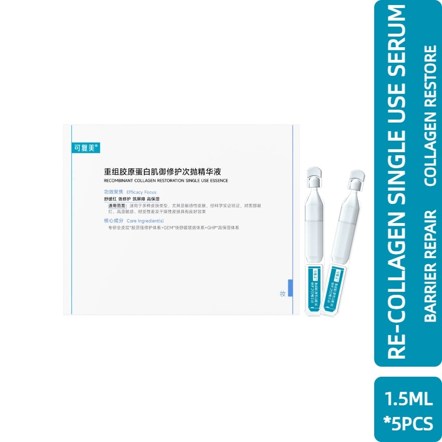 Best seller product accumulated 477million pcs globally sold. Single use package with B.F.S technology make the serum fresh and active. Patented Recombinant Collagen, 100% human like collagen, easy to absorb and reach the dermis layer: Type I for skin firming and tightness, Type III to make skin elasticity, small molecule collagen is only 217DA. This product has good skin repair function, with hydration and moisturizing, supplement collagen, reduce skin redness area, stabilize the skin state, make the skin more tender and smooth, repair the skin barrier and other efficacy, is a liquid ingredient, applicable to all skin. Clinically Test Real User Proven Results: 100% of the subjects agree mild and non-irritating, good repair effect, good soothing effect, good moisturizing effect, suitable for sensitive skin.