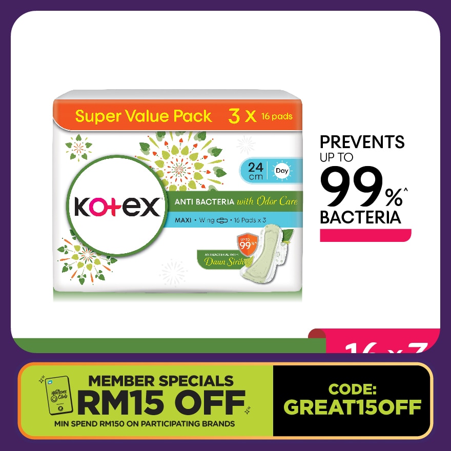 Kotex Anti Bacteria with Odor care super absorbent pad contains Daun Sirih extract and Anti Bacteria layer that helps prevent up to ninety nine percent growth of bad bacteria and control unpleasant odor.