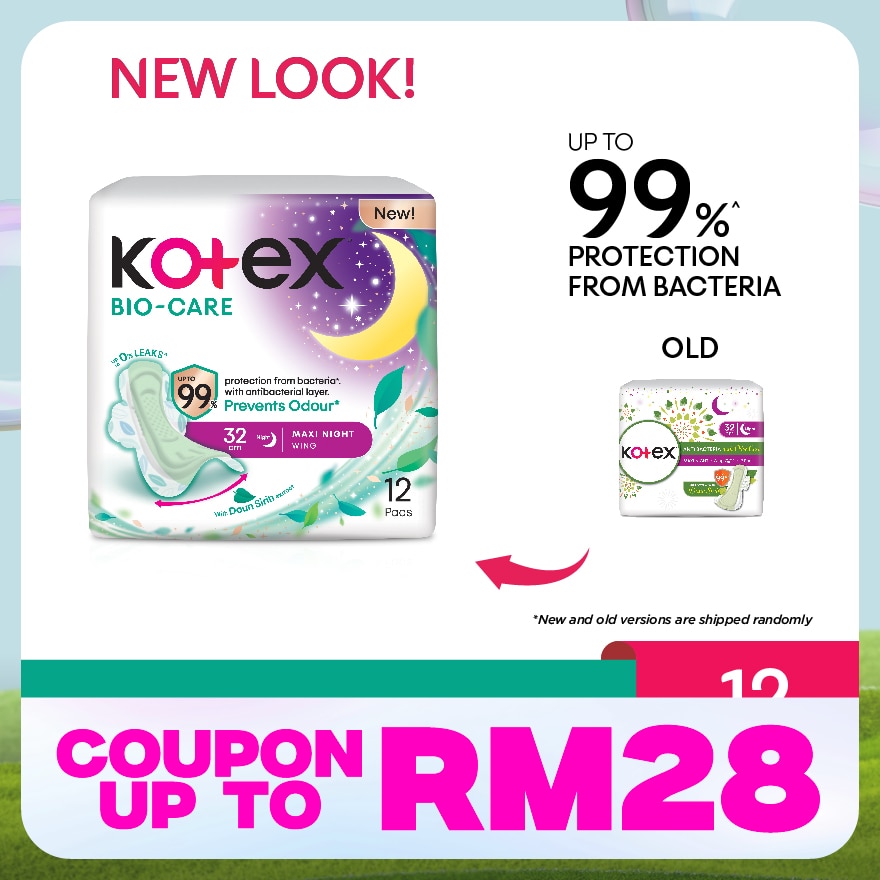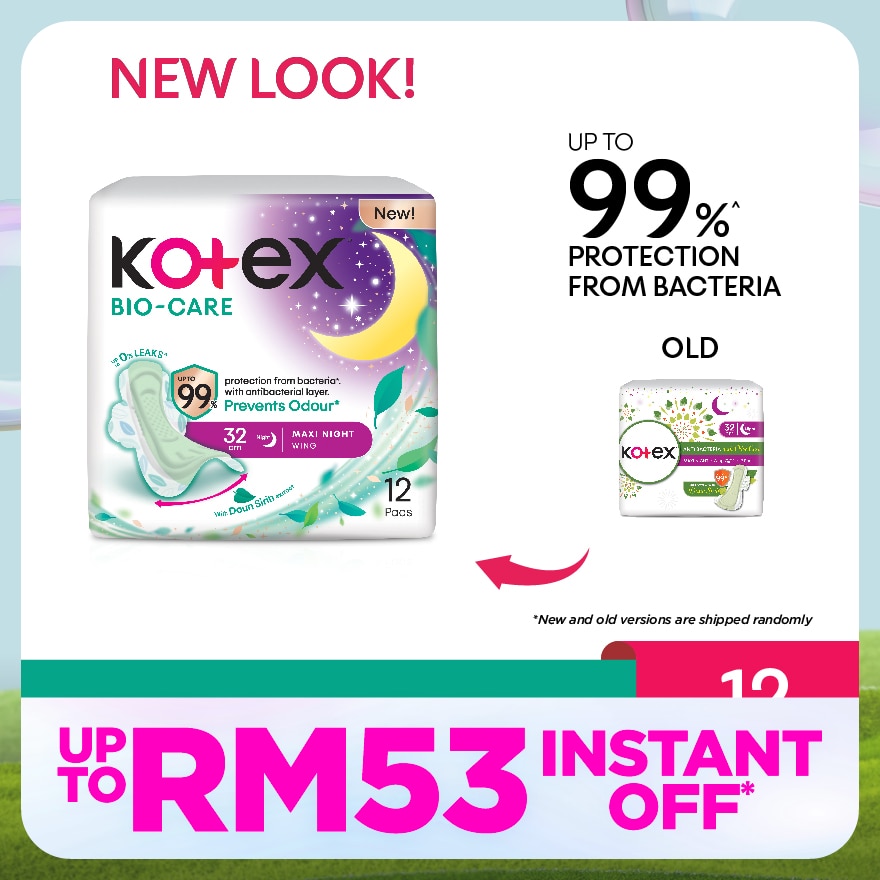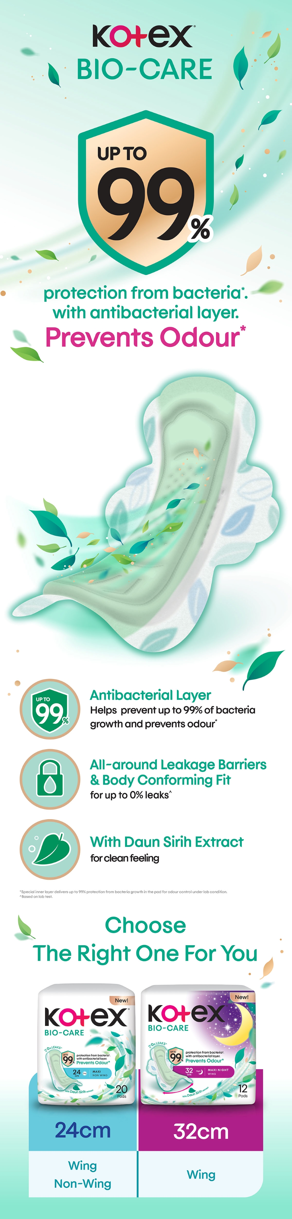 Kotex® Biocare newly upgraded with super-absorbent pad ensures up to 0% leaks^, with Anti-Bacterial layer that helps prevent up to 99%* growth of bad bacteria and contains Daun Sirih extract to help prevent unpleasant odour.