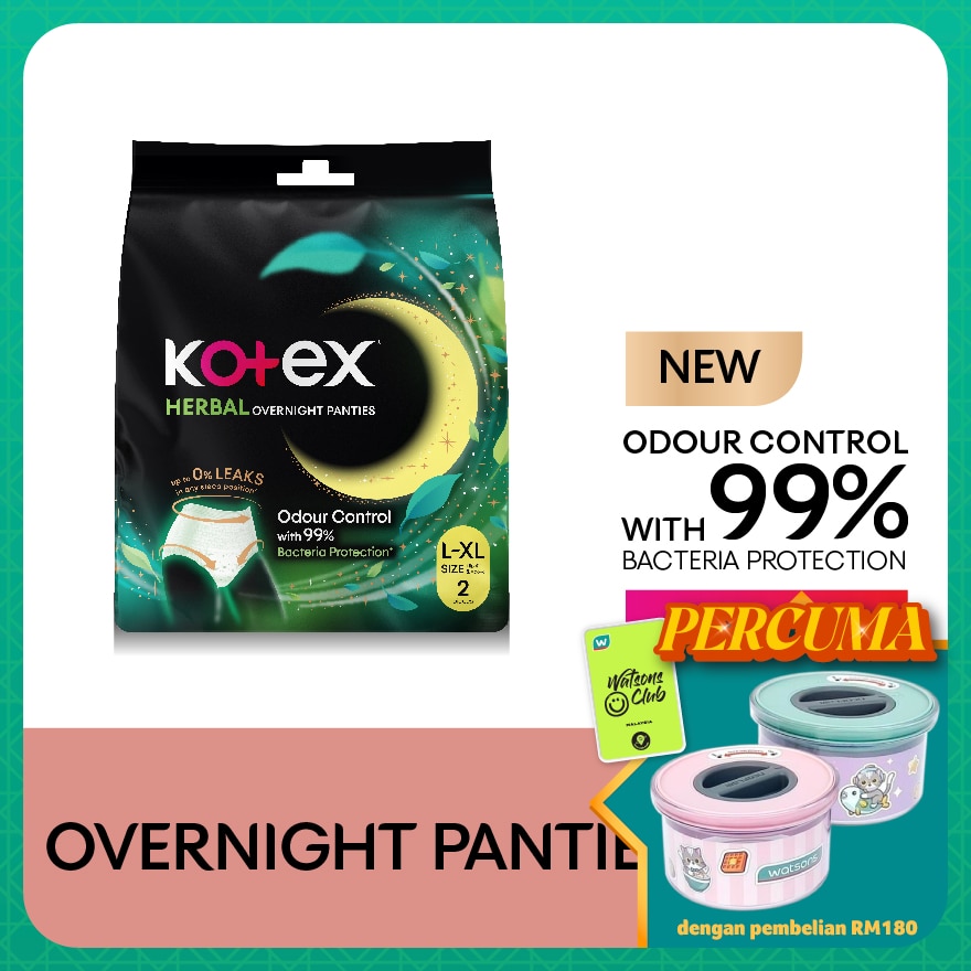 Kotex® Overnight Panties is a disposable period panty, designed for odor control with 99% bacteria protection. Experience a better night’s sleep in any position with our innovative 360° anti-leakage protection, providing you up to 0% leaks in any sleep position.