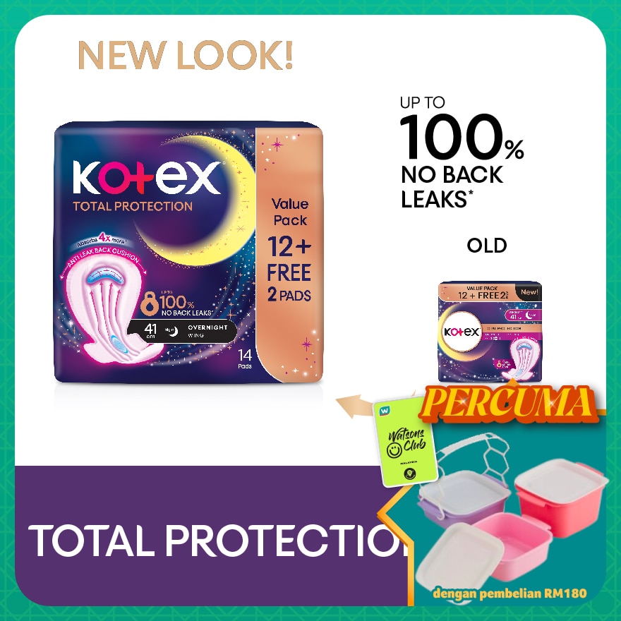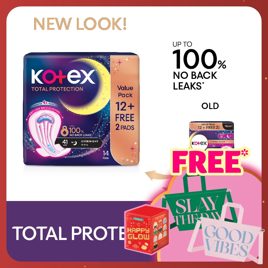 Kotex® Total Protection pads - The all-new Kotex Total Protection with Anti-Leak Back Cushion provides a protective barrier for up to 100% no back leaks^ so you can sleep un-interrupted. Helps give you the extra confidence and reassurance even during heavy flow nights.