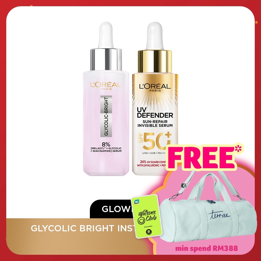 GLYCOLIC BRIGHT INSTANT GLOWING SERUM. With 8% Glycolic Acid, reducess dark spots by 57%, brightens for even glowing skin. With 8% brightening Glycolic Acid our highest concentration, this serum is clinically proven to instantly brighten skin and reduce dark spots. UV DEFENDER ANTI AGING SERUM: OUR 1st UV PROTECTION IN A SERUM WITH 24% UV GUARD COMPLEX WITH [HYALURON + PEPTIDES] Powerful Skin solution for fast, visible results. Powerful concentration of UV filters and skincare actives to prevent and correct photoaging signs. VERY HIGHT PROTECTION SPF50+: Reduce -26% Dark Spots Daily broad-spectrum filtering system provides SPF50+ and long UVA protection. Protect from skin aging signs induced by UV such as dark spots, dullness and fine lines. HYALURONIC ACID: Reduce -14% Fine lines Known for its capacity of retaining multiple times its weight in water, HA intensely hydrates and replumps skin while smoothing skin surface to visibly reduce fine lines. PEPTIDES: Improve +29% Radiance Powerful actives recommended by dermatologists. enriched with peptides our formula helps to smooth aging signs. Non greasy, fast absorbing formula applies easily & smoothly. Leaves no white marks & feels invisible on skin for 90%** of women. Suitable for all skin types, even oily skin Direction: Apply daily on face and neck *clinical evaluation of visible aging signs done on 40 women during 12 weeks** Consumer test on 65 women during 4 weeks.