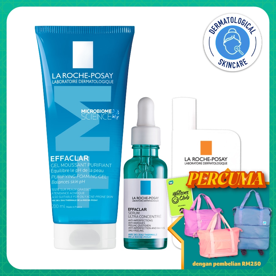(Effaclar Purifying Foaming Gel): Specially Formulated For Oily, Acne-Prone Skin. Gently cleanses/washes dirt and oil while respecting the skin's pH balance at 5.5. Removes dirt and sebum away from the surface of the skin without disrupting its delicate balance and leaves the skin feeling clean and fresh. With soothing, anti-irritant La Roche-Posay thermal spring water. Proven to reduce acne, blemishes, blackheads and control shine. Leaves skin feeling clean and fresh. Use as a daily face wash for oily skin. Soap-free. Paraben-free. Alcohol-free. Oil Free (Effaclar Serum Anti-Acne Concentrate): Specially Formulated for Oily, Acne-Prone Skin. ULTRA CONCENTRATED FORMULATION WITH TRI-ACID COMPLEX AND SOOTHING NIACINAMIDE. This formula is effective on persistent imperfections and marks, visible pores and is also suitable for acne-prone skin. Contains: Salicylic acid: Unclogs pores from sebum accumulation, LHA: smooths skin surface without discomfort, Glycolic acid: improves skin renewal. (Anthelios UVMUNE 400 Oil Control Fluid SPF 50+): Broad spectrum and very high protection (UVA, UVB). Protect against deep cell damage. Dry touch finish with 12hrs mattifying effect.