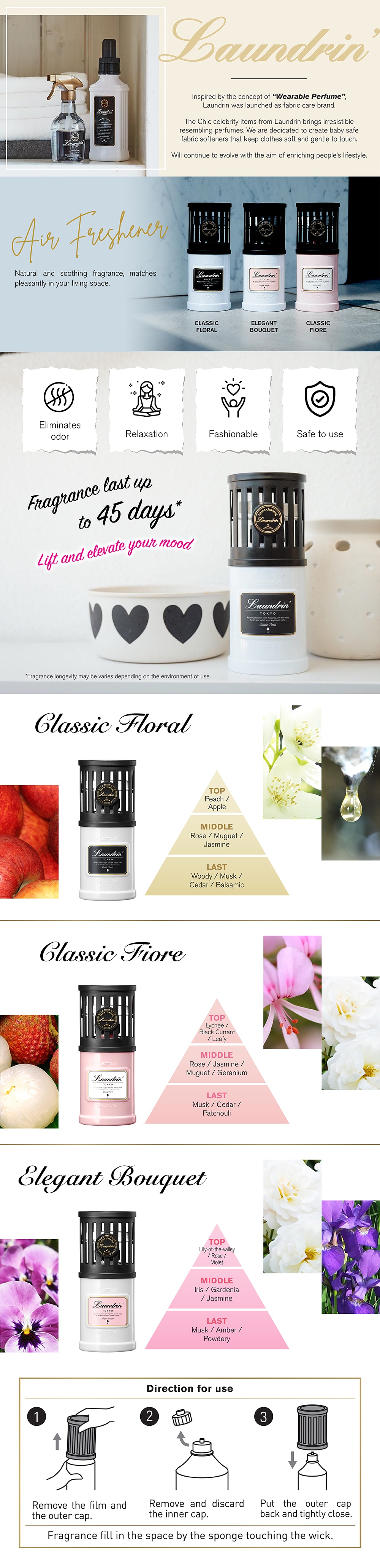 Remove the top cover. Unscrew the small cap. Invert the bottle to soak the cotton sponge with the scent. Ensure the cotton stays within the catchment of the top cover and cap it back on. Enjoy Laundrin's premium fragrance in your home.If the scent is fading, invert the bottle again to ensure the sponge is filled with the fragrance