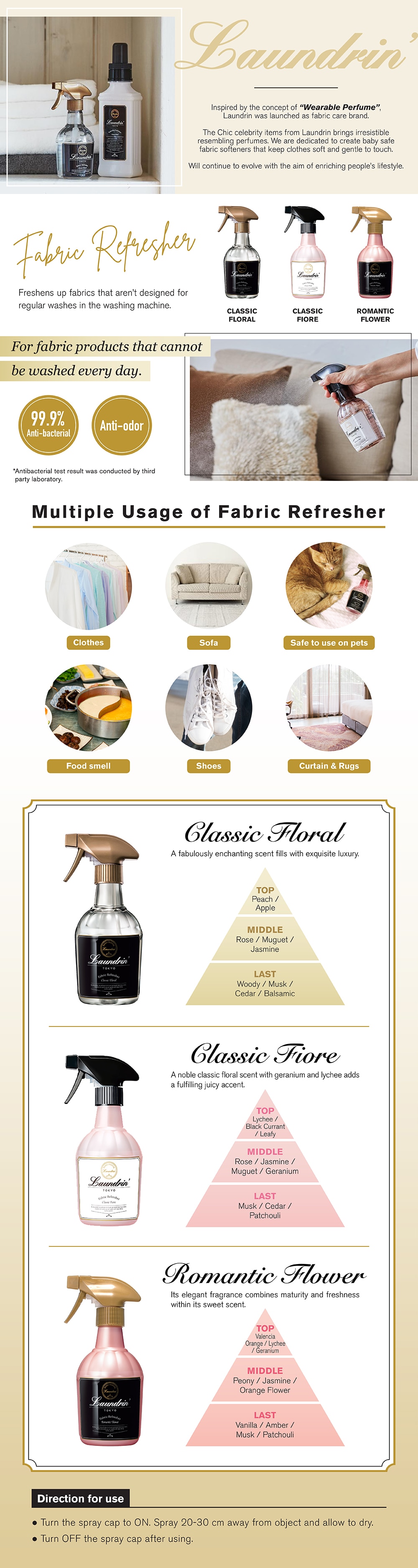 Water, Ethyl alcohol, Polyoxyethylenalkylether, Deodorizer, Fragrance, Alkyldimethylbenzylammonium chloride, Tetrasodium EDTA, Citric acid, Polylysine, Sage leaf extract, Thyme extract