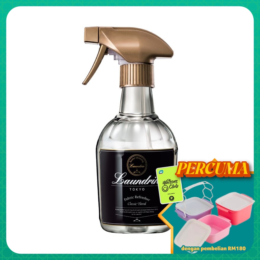 Laundrin Fabric Refresher Classic Floral 370ml.It eliminates bad smell from cigarettes, sweat, and bacterial multiplication. .It can also be used as a room fragrance..Recommended to use on fabric products that cannot be washed every day..LAUNDRIN'S SIGNATURE FRAGRANCE - A luxuriously elegant and dreamy scent of delicate blooms with hints of Peach,Apple and Rose.Antibacterial & anti-odour.