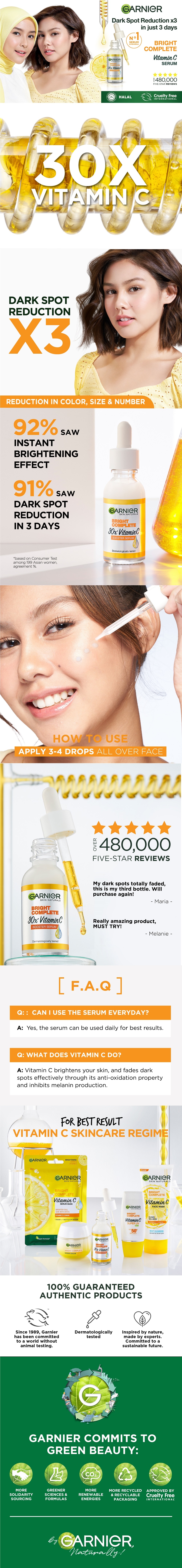 The new Garnier Light Complete Vitamin C Booster Serum, our lightening formula enriched with 30X* Vitamin C and fresh Yuzu Lemon extract from Japan. This light and fast -absorbing texture acts deeply* at various stages of the melanin darkening process. The result: with PROVEN ACTIVE helps reduce darkening of melanin by 85%** in just 6 days. The skin looks bright and smooth and disguises blackheads.