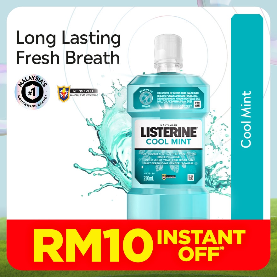 Listerine® Cool Mint kills 99.9% of germs that cause bad breath for fresher breath.- Unique formula with 4 essential oils deeply penetrates to kill bacteria in the plaque biofilm.- Recommended for daily use.