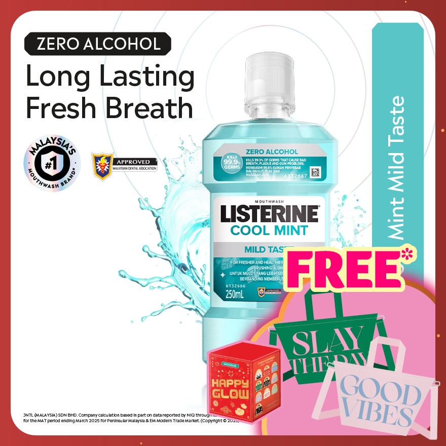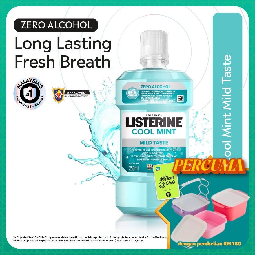 Listerine® Cool Mint Less Intense kills 99.9% of germs that cause bad breath for fresher breath.- Non-alcohol formula for a LESS INTENSE TASTE.- Unique formula with 4 essential oils deeply penetrates to kill bacteria in the plaque biofilm.- Recommended for daily use.