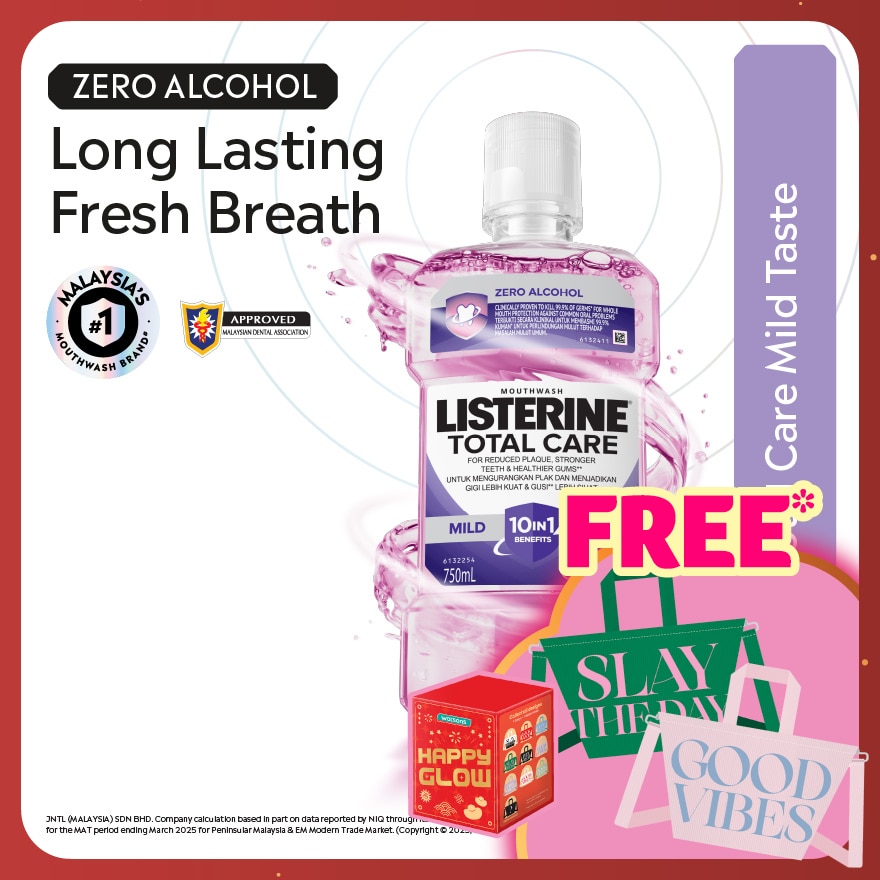 Listerine® Total Care Less Intense mouthwash with fluoride, clinically proven to clean and protect with 6 benefits for a healthier mouth*. LESS INTENSE TASTE.1) Strengthens teeth and helps prevent cavities2) Helps maintain healthy gums3) Helps redice plaque formation4) Helps keep teeth naturally white by preventing tartar build-up5) Kills/Fights 99.9% of germs that cause bad breath, plaque, and gum problems6) Freshens breath*Based on consumer test, versus brushing alone.