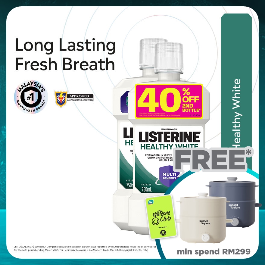 Listerine® Healthy White with natural lemon and salt provides 3X more whitening than brushing alone for naturally whiter teeth in 2 weeks. With a breakthrough multi-action formulation containing natural lemon and salt that: Helps reduce stain formation on teeth, Helps form protective shield against stains, Fight germs that cause plaque and bad breath, Contains fluoride to help strengthen teeth