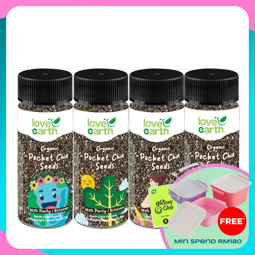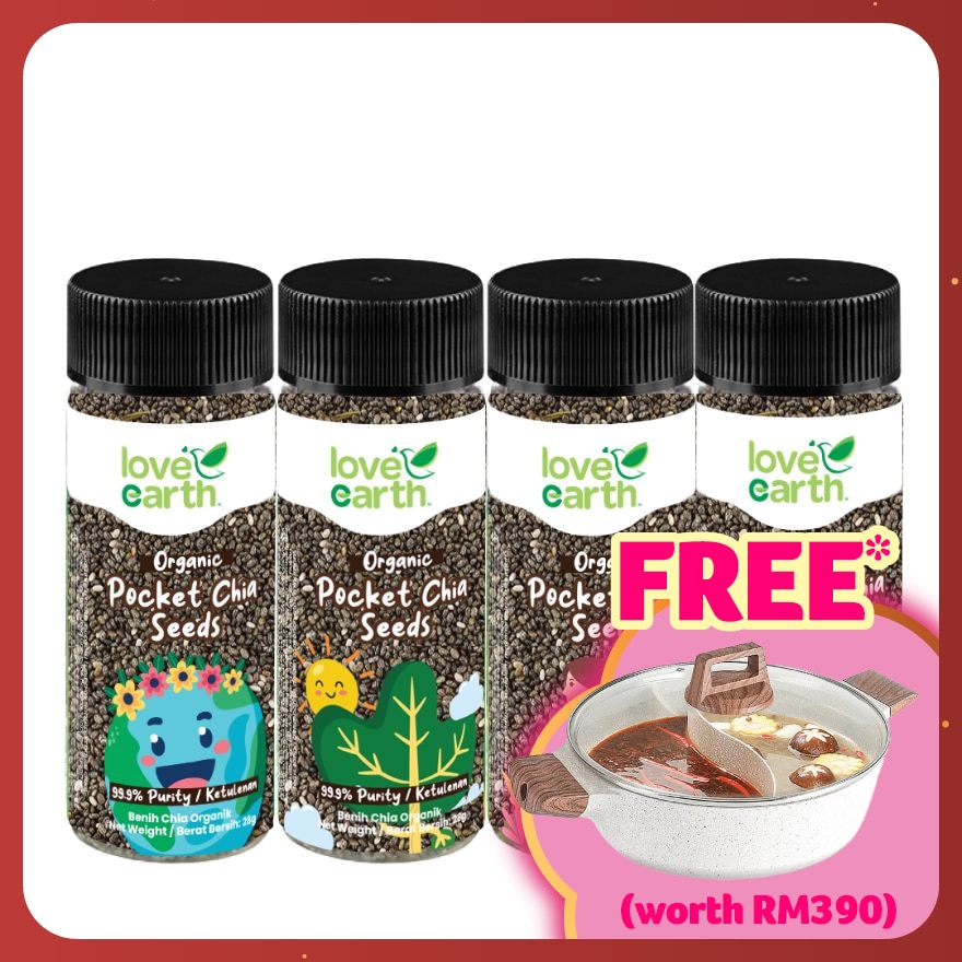 Love Earth Organic Pocket Chia Seed 4 in 1 4X28g 99. 9% Purity & 100% Organic Chia seed from Bolivia (Handy size). High in Omega 3 & Protein, Magnesium, Calcium. Reduces Heart diseases, Improves for bone health. Healthy Sprinkler, on Cereal, Yogurt, Salad, Juice, Porridge & Pudding. KKM Mesti certified, Jakim Halal certified, Australia NASAA organic certified.