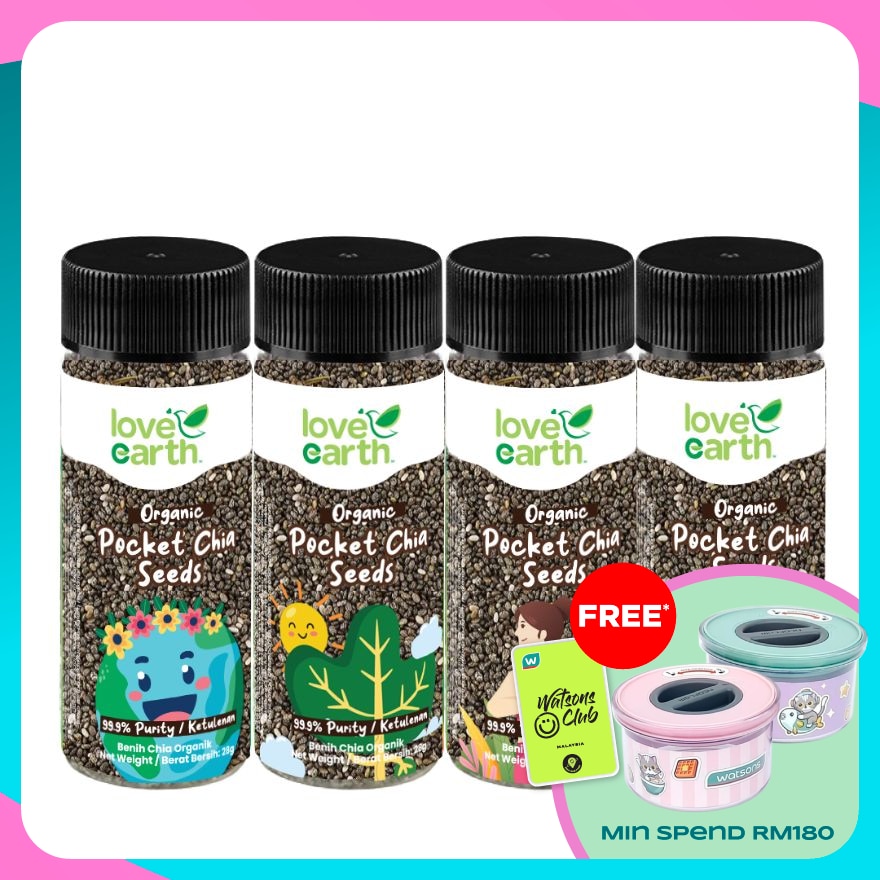 Love Earth Organic Pocket Chia Seed 4 in 1 4X28g 99. 9% Purity & 100% Organic Chia seed from Bolivia (Handy size). High in Omega 3 & Protein, Magnesium, Calcium. Reduces Heart diseases, Improves for bone health. Healthy Sprinkler, on Cereal, Yogurt, Salad, Juice, Porridge & Pudding. KKM Mesti certified, Jakim Halal certified, Australia NASAA organic certified.