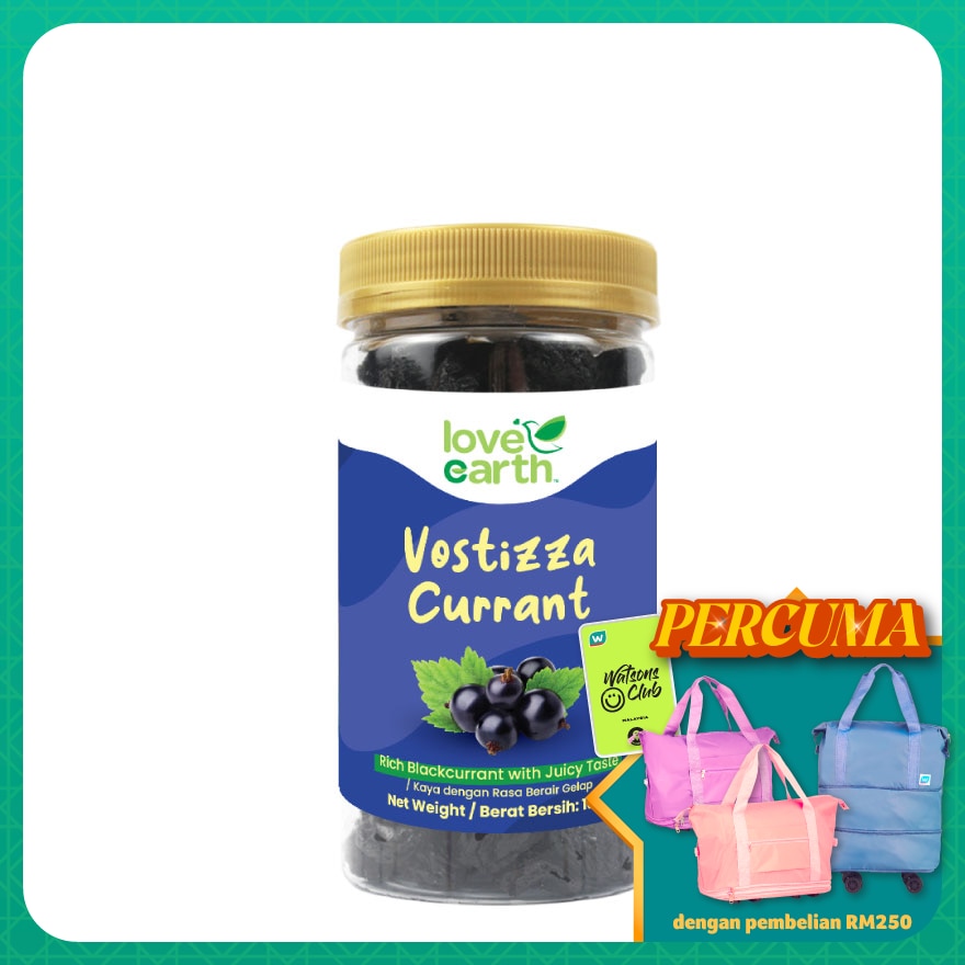 Love Earth Organic Vostizza Currant 180g 100% Organic Currant from Australia, Non-GMO, No Herbicides, Chemical Free. Rich in Antioxidant & Vitamin C, Enhances the Immune System. Our Australian Currant contains just whole!. Suitable for Age 1 to 100, Convenient yet Delicious!. KKM Mesti certified, Jakim Halal certified, Australia NASAA organic certified.