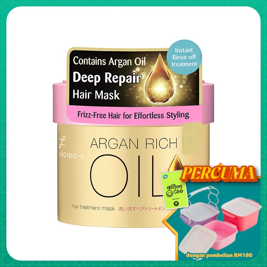 Lucido-L Instant Rinse Off hair treatment mask that enriched with Argan Oil helps to deep repair hair. Hair Treatment Argan Oil Series leaves hair shiny & beauty. It contains high concentration of argan oil as it is processed with extremely high pressure (equvalent to 10,000 meter depth pressure). The Series provide excellent penetration that blends into hair while restoring natural hair luster & shiny beautiful hair without greasy feeling.After shampooing, rinse and squeeze off excess water from hair, apply an appropriate amount (about the size of 2 cherries for semi-long hair) and massage into the hair, concentrating on damaged areas. Rinse thoroughly with water. Recommended use 1-2 times a week.