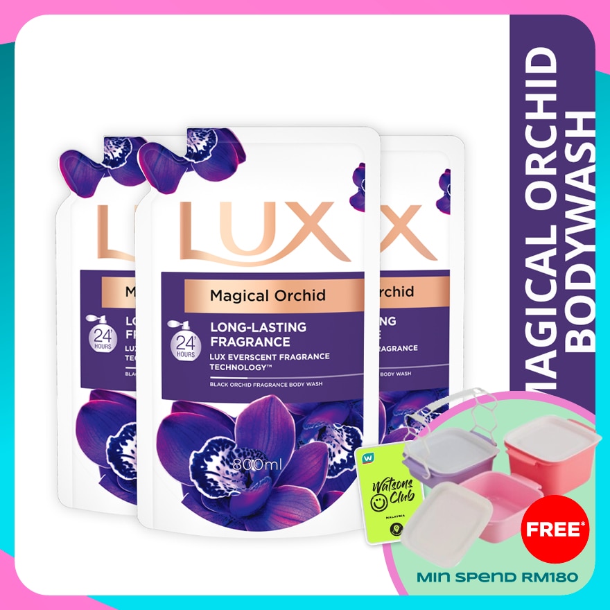 Promote the reuse of a full original packaging, to reduce packaging wasteAim to reduce packaging waste with this refill pack Introducing LUX Magical Orchid body wash for an extraordinary treat for your skin and senses. Lux Magical Orchid body wash is crafted by master perfumers with notes of black orchid and peony and uses groundbreaking Lux Everscent Fragrance Technology that provides 24 Hours Long Lasting Fragrance. Pour a drop of this fine fragrance body wash and gentle lather with a pouf. Massage all over your body to let the luxurious lather and its opulent fragrance embrace your skin and senses every day. Let Lux Magical Orchid transport you to a world of fine fragrance whilst pampering yourself to achieve long-lasting fragrant skin.