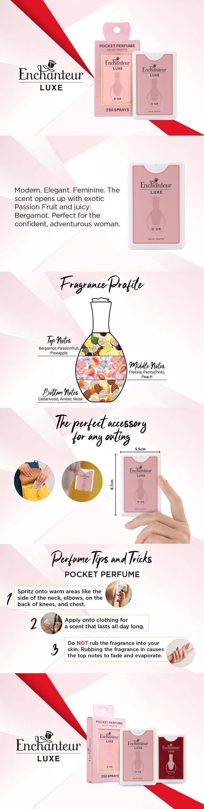 ENCHANTEUR HANDBAG EDT D'OR is modern, elegant and feminine. It opens up with exotic Passionfruit and juicy Bergamot. At its heart, Pink Peonies blend sensually with Musk and Cedarwood. This scent is represented by an inviting millenial rose gold hue - a celebration of uncontested beauty and luxury. A spritz will beckon adoration and admiration. Perfect for the confident, opportunistic woman.