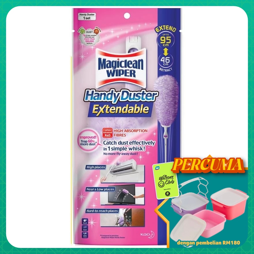 Duster is not reusable and cannot be washed. Handy Duster is designed for dusting surfaces only, and not to be used for other purposes. Not suitable for use on wet surfaces . Use light sweeping motions. Do not use on splintered surfaces to avoid tearing of fibres. To avoid scratches, do not use on TVs, LCD screens, furniture or other delicate surfaces if grains, sand, or hard dirt particles are trapped in Duster. Do not use on exteriors of automobiles. Turn off power sources of TV and other home appliances before dusting. For light bulbs pr objects with high temperatures, turn off power supply first and allow to cool before dusting. Avoid exposure of Dsuter to direct sunlight and high temperatures. Do not leave Duster on plain wood or furniture for extended periods of time. This may result in discolouration. Excessive force may cause Handle to break. Do not force Duster into spaces if it doesn't fit. This may result in Duster detachment and damage.