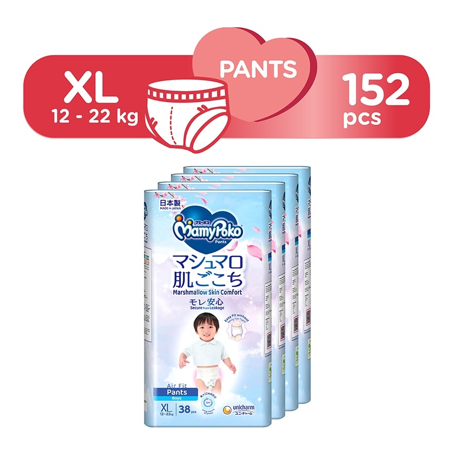 MamyPoko Air Fit Marshmallow Pants diaper are formulated with ingredients that consider for baby’s safety to provide the Marshmallow Softness for Baby’s delicate skin, while delivering 12 hours absorbency ※ for long hours dryness. This is our softest Super Premium baby diaper, 100% Made in Japan with comfortable soft material and plant- based oils to prevent skin irritation. Aiming “0” leakage with Marshmallow fit design that fits back and thigh snugly. It is free from harmful chemicals in which there is no nasties like petroleum derived oils, chemical fragrances, latex and artificial colourants on top sheet. Besides, the breathable design allows air flow, keeping your baby cool and comfortable. We know a happy baby means a happy family.