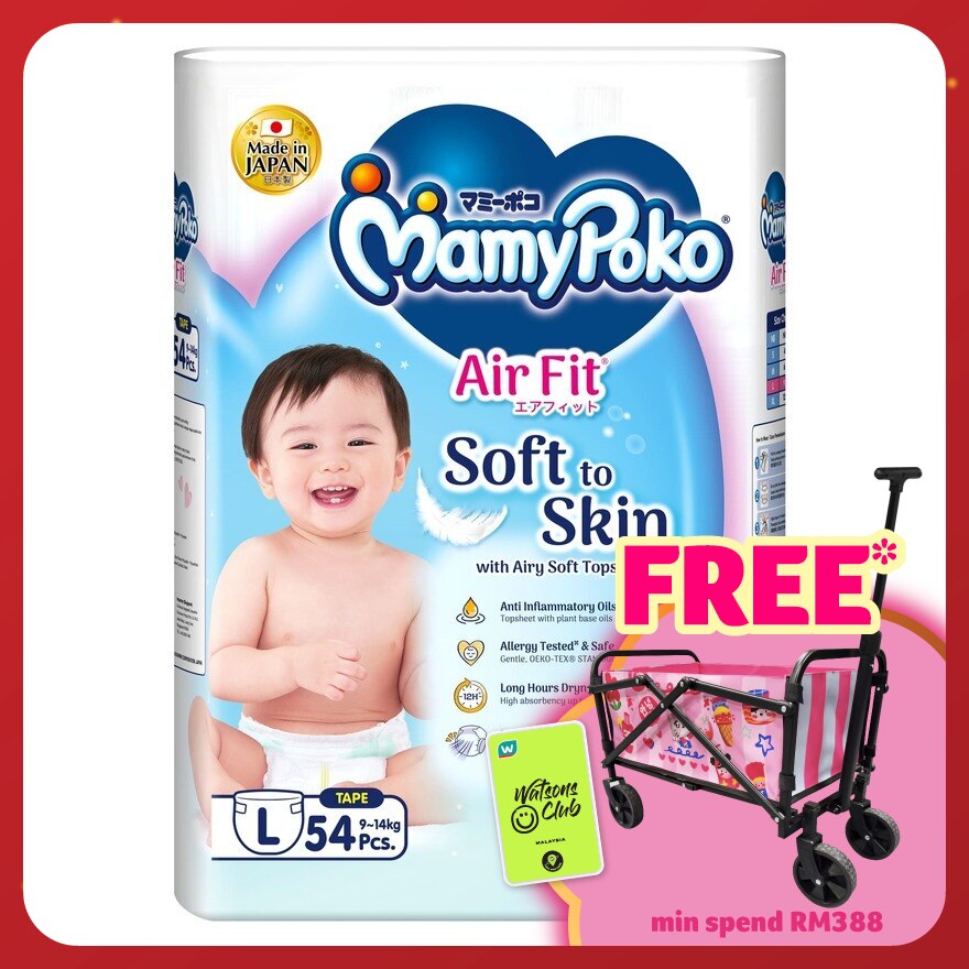 Step 1: The back of the diaper has the re-attachable tapes on it. Open up the diaper flat and pull the side gathers upright. Step 2: Place the back half of the diaper under your baby making sure that the top area of the back reaches up to your baby's waist to ensure a snug fit. *Check this again after you've finished putting on the diaper. Step 3: Place one hand on the diaper on top of your baby's stomach to ensure that the diaper stays flat. Using the other hand, pull up the re-attachable tape and fasten it to the front of the diaper. Repeat on the other side. *Make sure the tape does not touch your baby's skin.
