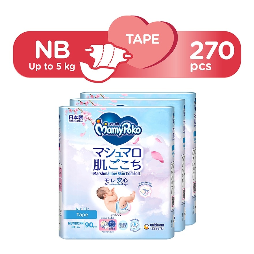 This is our softest Super Premium baby diaper, 100% Made in Japan with comfortable soft material and plant- based oils to prevent skin irritation. Aiming “0” leakage with Marshmallow fit design that fits back and thigh snugly.
