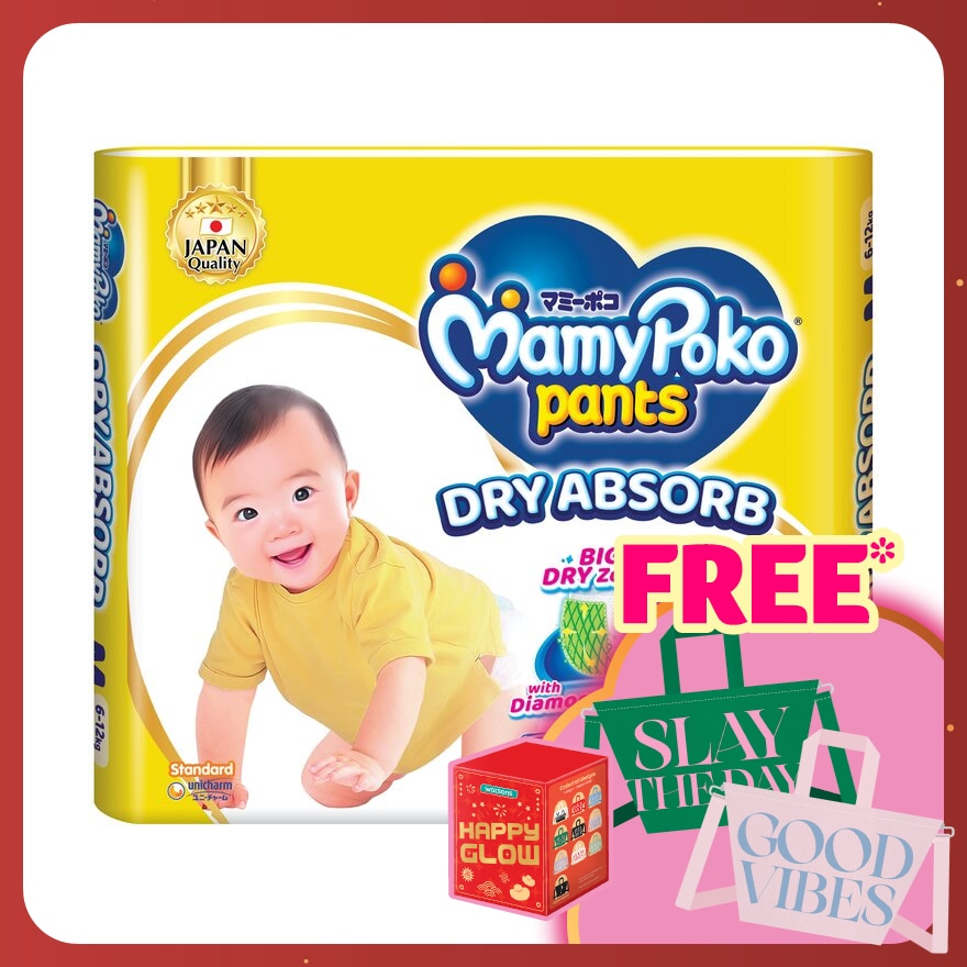 MamyPoko Standard has Superior Absorbency, Breathable Waistline, Triple Fit, All-Round Stretch Keeps bottom dry with superior absorbency up to 10 hours Air-Flow comfort prevents stuffiness to keep fresh and comfortable Fits well gathers to minimize gaps and prevent sagging Soft and comfortable fit in every movement.