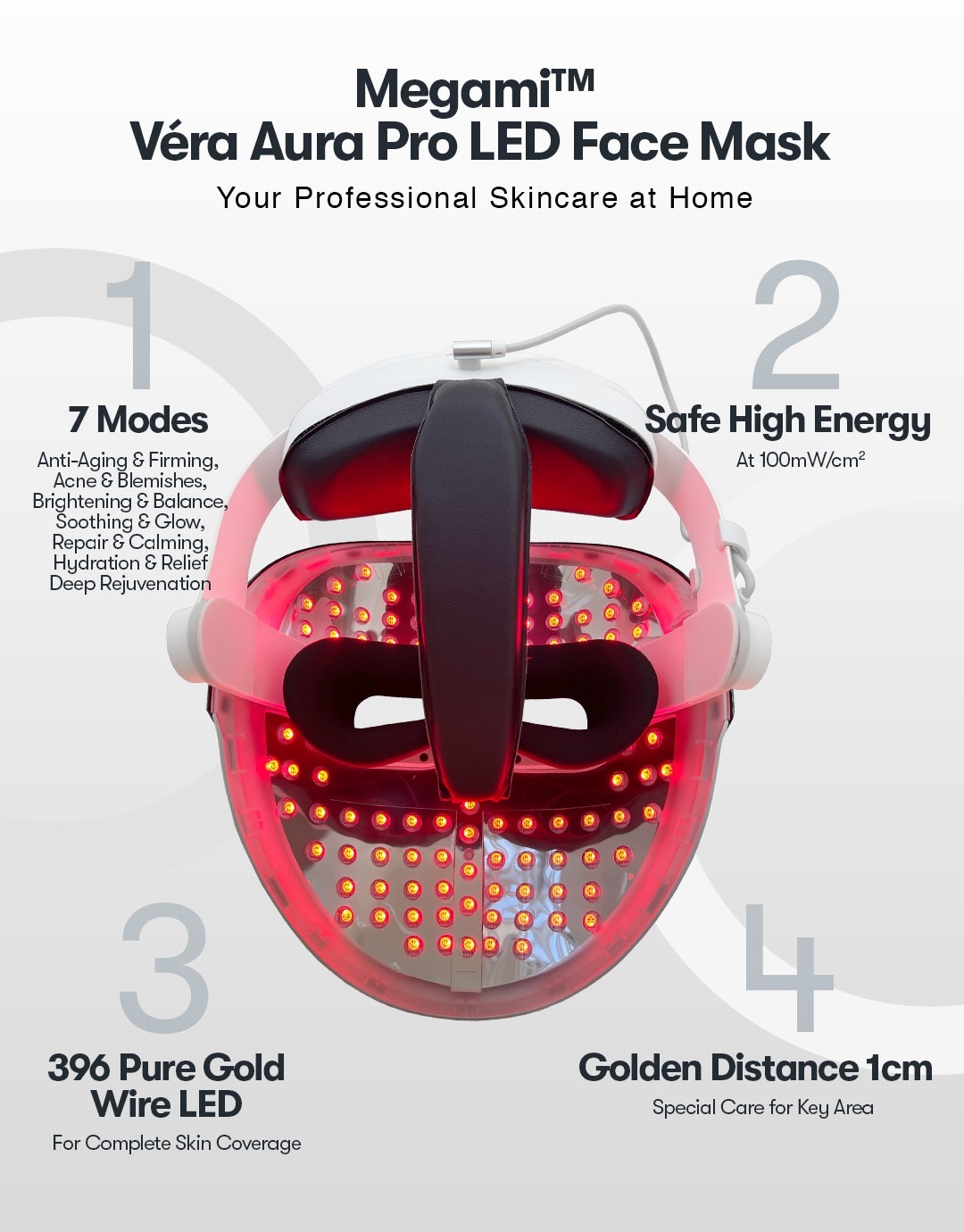 The Vera Aura Pro combines seven specialized LED light modes, adjustable brightness levels, and an ergonomic full-face mask design to deliver comprehensive skincare treatment comfortably and effectively. With consistent use, this device helps improve skin clarity, boost radiance, support collagen production, and promote healthier-looking skin.