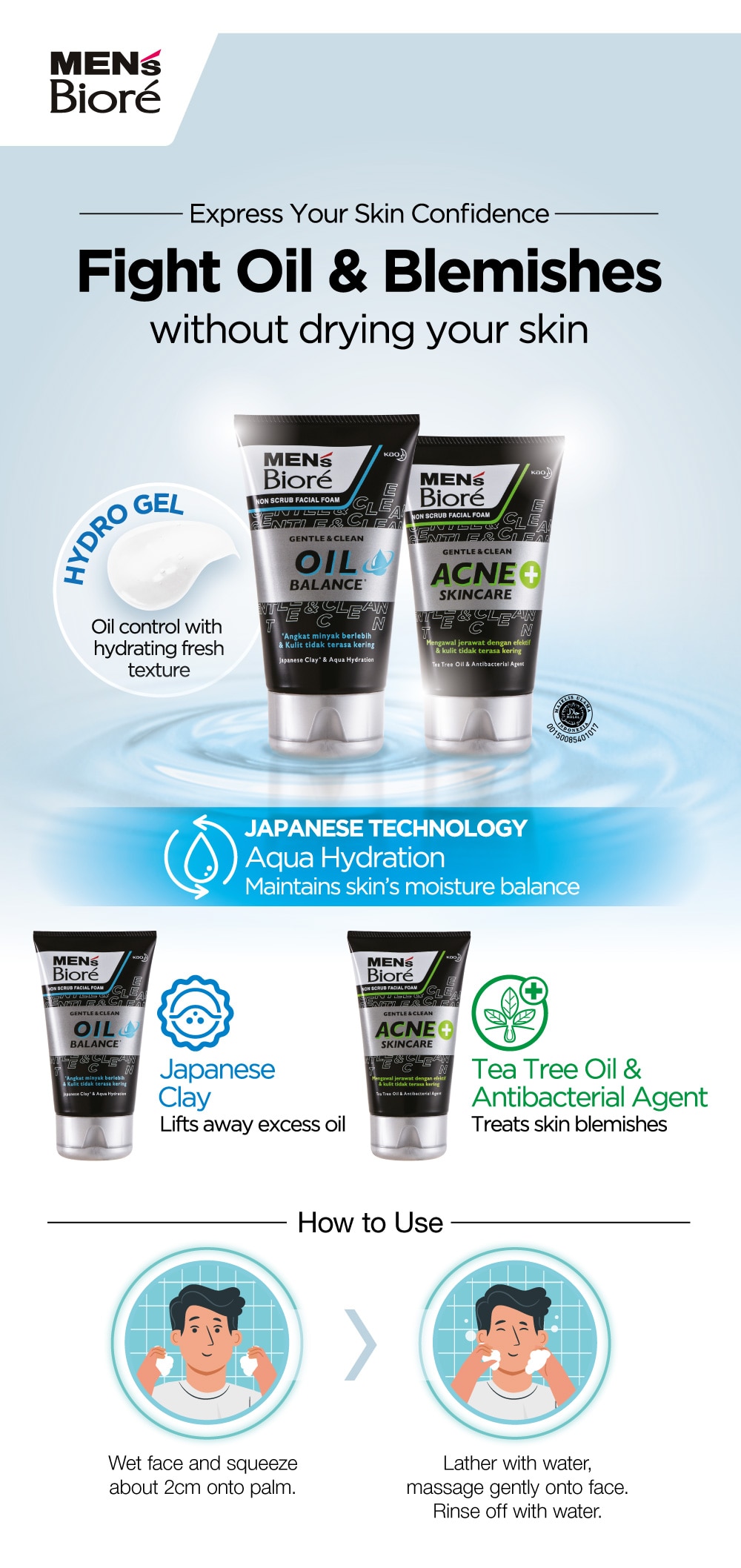 Wet face, squeeze about 2cm onto palm. Lather with water and massage gently onto face and rinse thoroughly with water