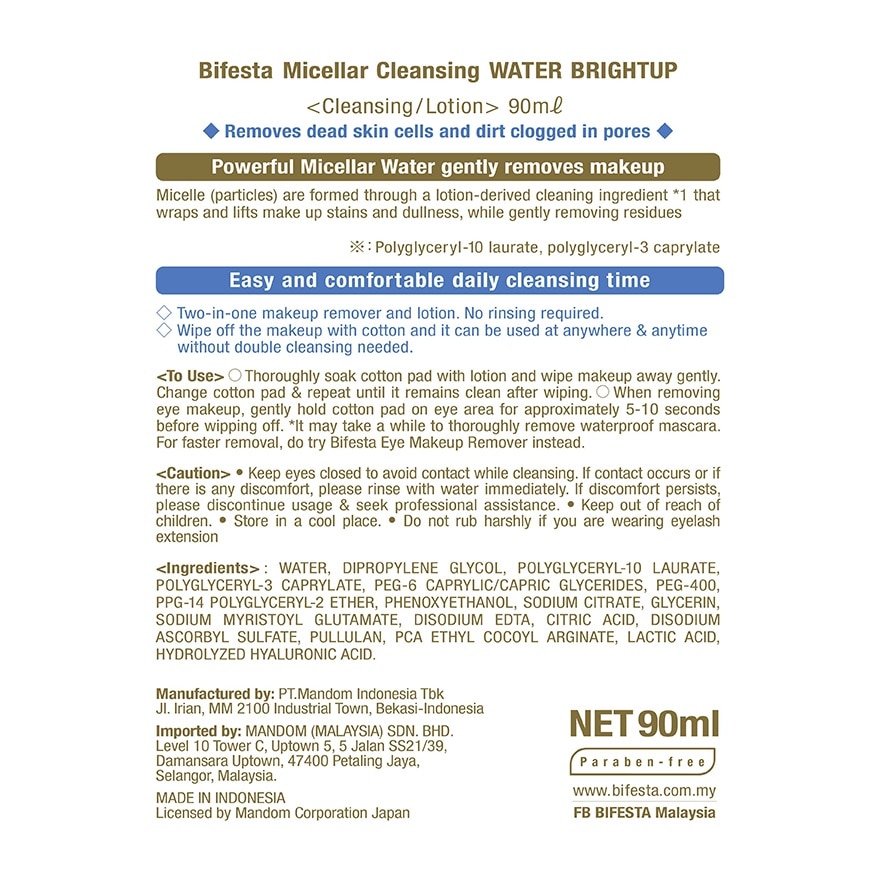 Bifesta Micellar Cleansing Water Brightup is gentle yet powerful thoroughly removes makeup and dirt. Bifesta Micellar Cleansing Water Brightup consists of Lactic Acid and Vitamin C to improve skin clarity and brighten dull skin. It also come with moisturizing absorptive Hyaluronic Acid that makes your skin feel freshly moisturized skin protected from dryness. It consists 3-in-1 beauty benefits: Cleansing, Face Washing and Lotion all in one simple step. No oil, colorant, fragrance and alcohol. Hypoallergenic formulation which is friendly to sensitive skin. - Contains Moisturizing Vitamin C (Moisturizing)/ Lactic Acid (Softens dead skin). - Removes dead skin and impurities from pores. - For clearer & brighter skin.