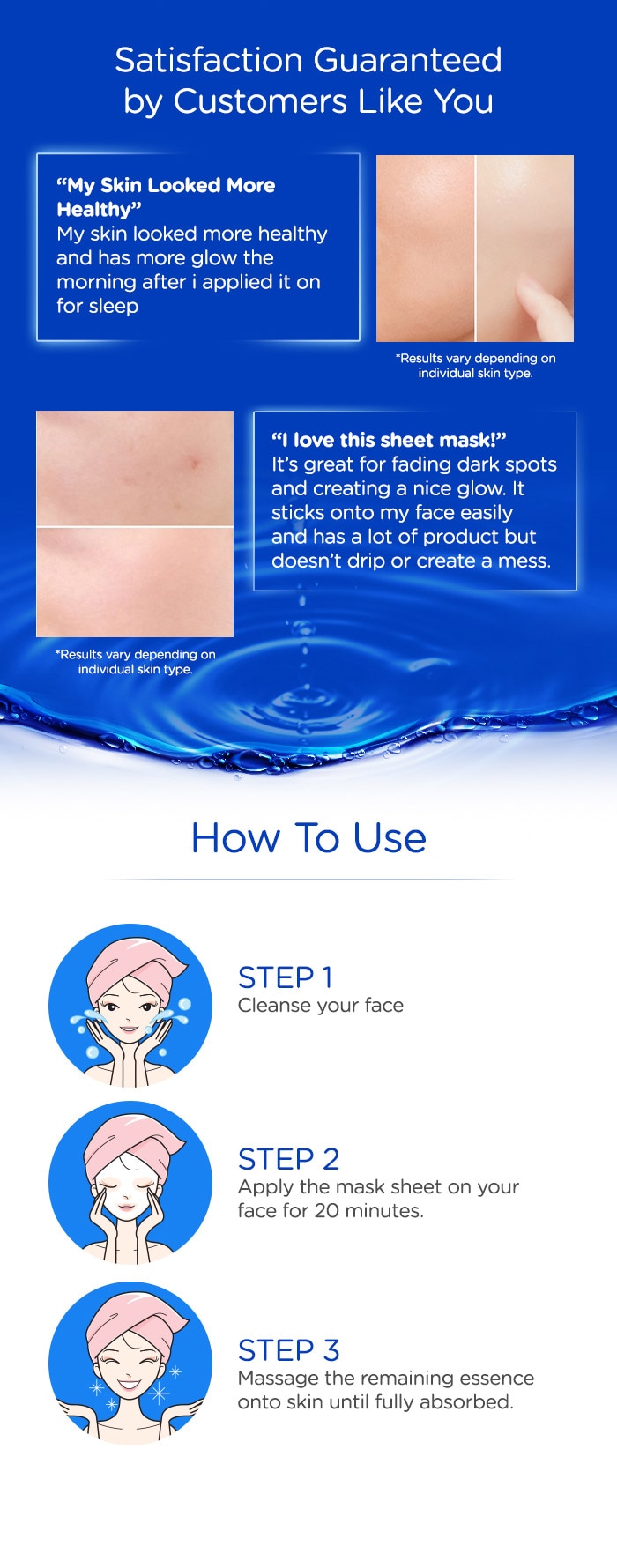 Place the mask sheet on your face. Smooth out mask to ensure a perfect fit. Relax for 20 minutes before removing the mask. No need to rinse off. Massage the remaining essence onto skin until fully absorbed.