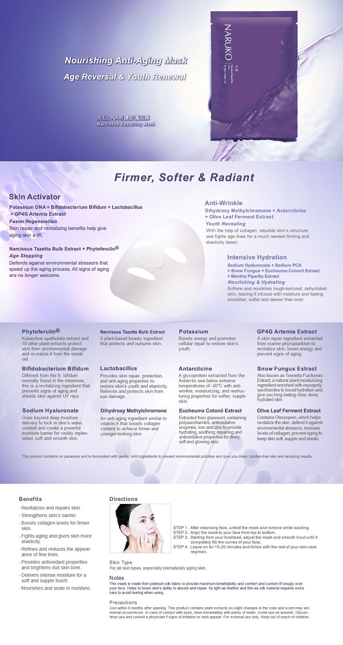 This mask is specially designed for prematurely aging skin. Coordinating with high effective protective and hydrated formula, it cherishes damage and weak skin and radiates refined and healthy shine.