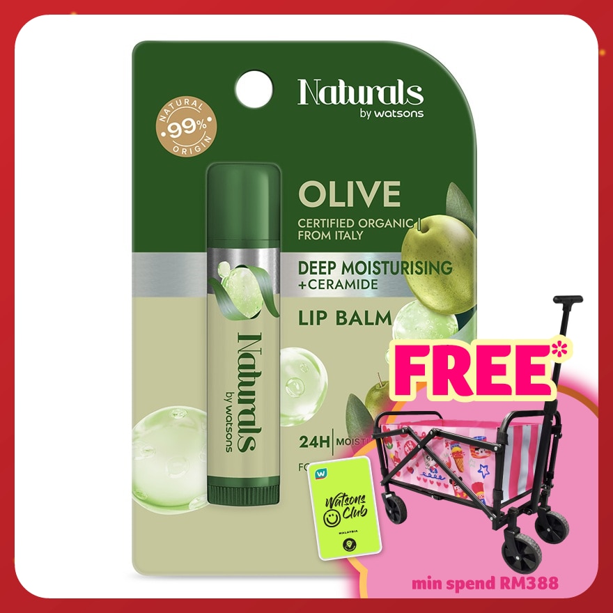 Ingredient you can trust with a reduced environmental impactThis product was formulated without over 20 unwanted ingredients. Promote paper packaging made with paper from responsibly managed forests, or with recycled contentThe paper used in this packaging is certified by FSC.Naturals by Watsons Olive Lip Balm contains a unique blend of Certified Organic ingredient designed to moisturise and help prevent chapped lips. Lips stay soft, smooth and supple, the way nature intended.